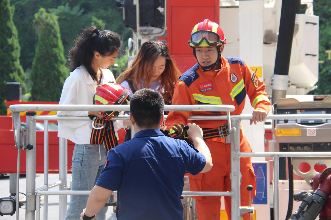 The fire commanders explained the operation and use of various fire-fighting equipment groups, demonstrated the performance and role of various fire rescue vehicles, and invited students to board the fire safety publicity vehicle for visit and learn. The detailed explanation and on-site demonstration of the Bolangtao 101m ascent platform fire truck aroused great interest of the students. This vehicle is currently the only one in Dalian, and also the highest ascent platform fire truck in Dalian, which once showed its heroic nature in the Triumph International Building fire.