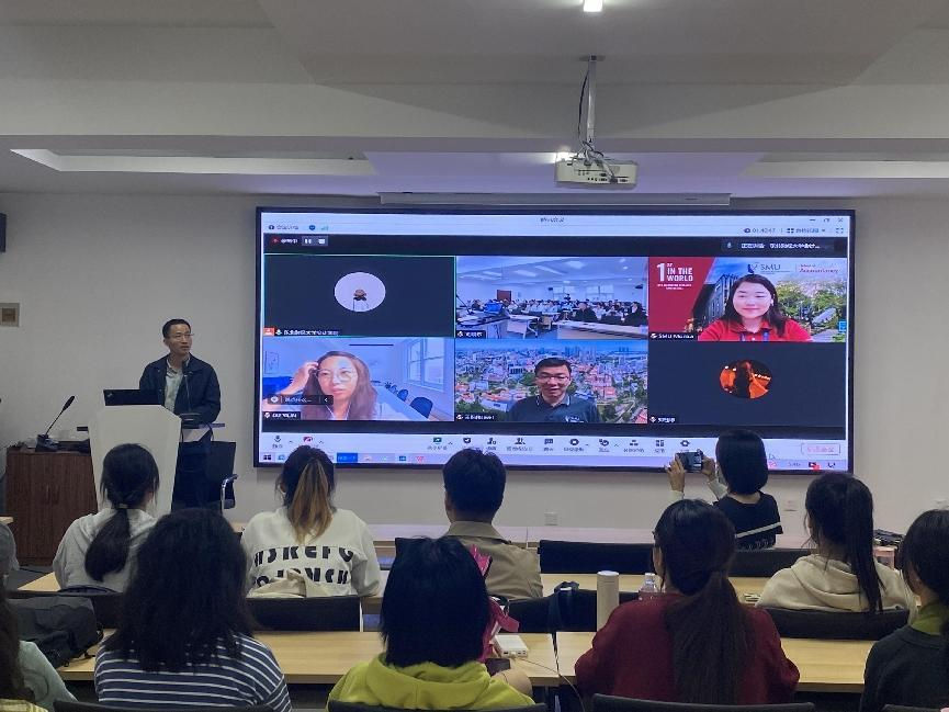 In the subsequent interactive session, the students also showed a strong interest in the cooperation project, and Jiwei Wang and Yilin Du answered the students' doubts online. Finally, Kejing Chen summarized the seminar and hoped that students would cherish the opportunity to participate in the project actively. At the same time, he warmly invited the leaders and teachers from Singapore Management University to visit Dongbei University of Finance and Economics.